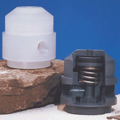 This design also allows high pressure and flow rates, with minimal pressure drop. Due to the balanced design, valve outlet pressure (backpressure) can be as high as inlet pressure without affecting performance. For mounting the valve securely, 1/4-20 tapped holes are provided in the base of the body. There are no exposed metal screws or other hardware on the exterior of the 1/2" valve which allows for mounting in a sump. Optional coated springs and fasteners available; consult factory. Standard valves are built for pressure service. If vacuum is desired it must be stated on order.